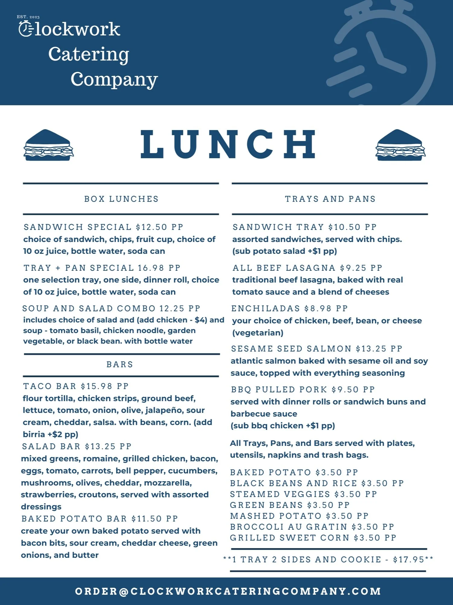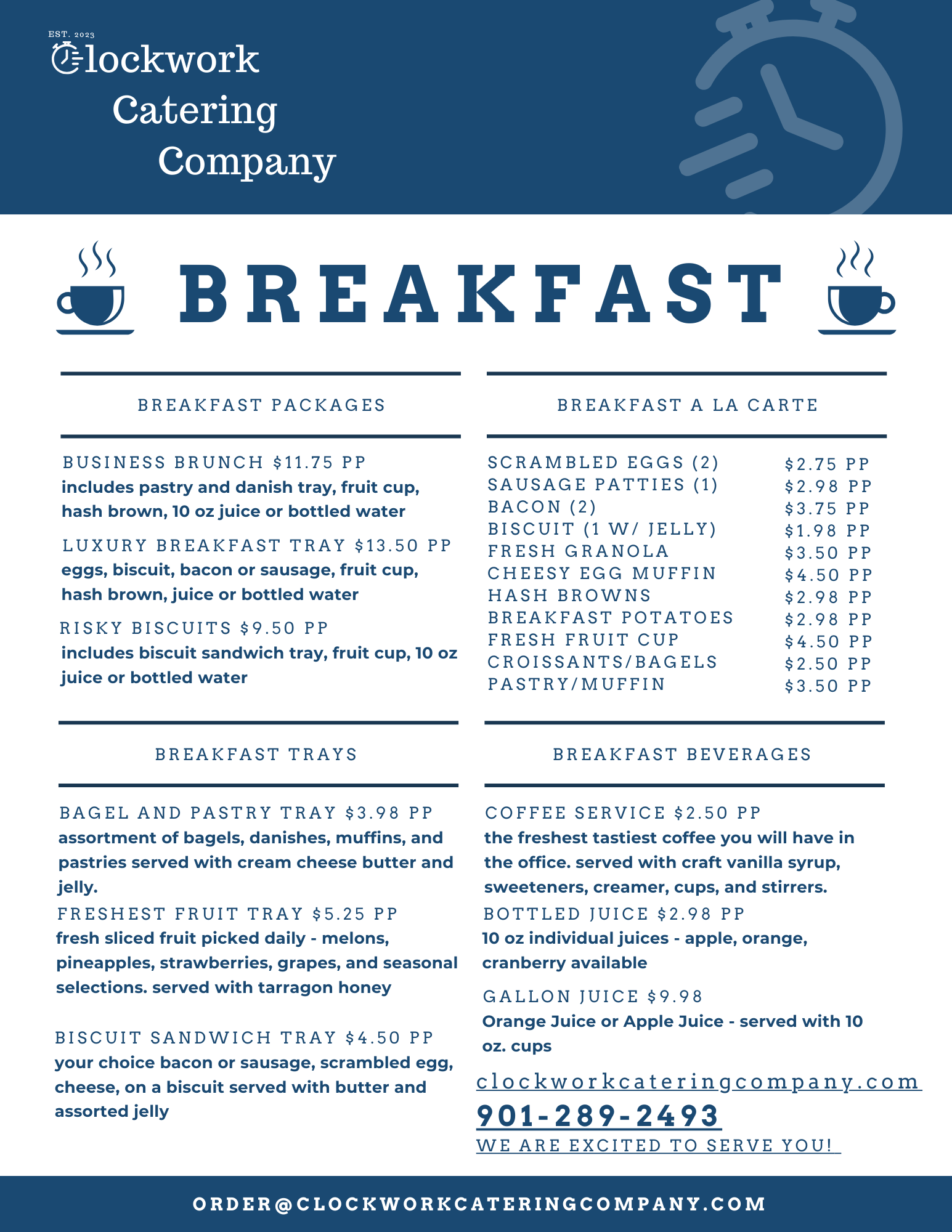 Breakfast, Lunch, Dinner, CoffeeCorporate Catering - Private Events order@clockworkcateringcompany.com 901-289-2493 ORDER NOW